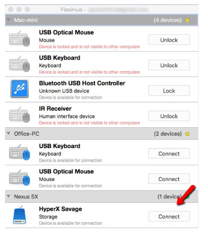 In FlexiHub on the remote computer, find your USB device in the list and click to connect: